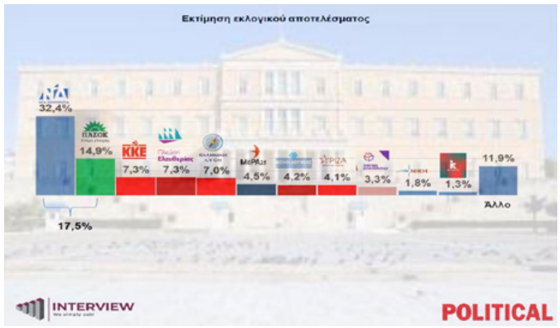 Στην εκτίμηση εκλογικού αποτελέσματος, η ΝΔ φτάνει το 32,4%, το ΠΑΣΟΚ το 14,9%, ενώ ΚΚΕ και Πλεύση Ελευθερίας ισοβαθμούν στο 7,3%. Ακολουθούν η Ελληνική Λύση με 7% και το ΜέΡΑ25 με 4,5%.