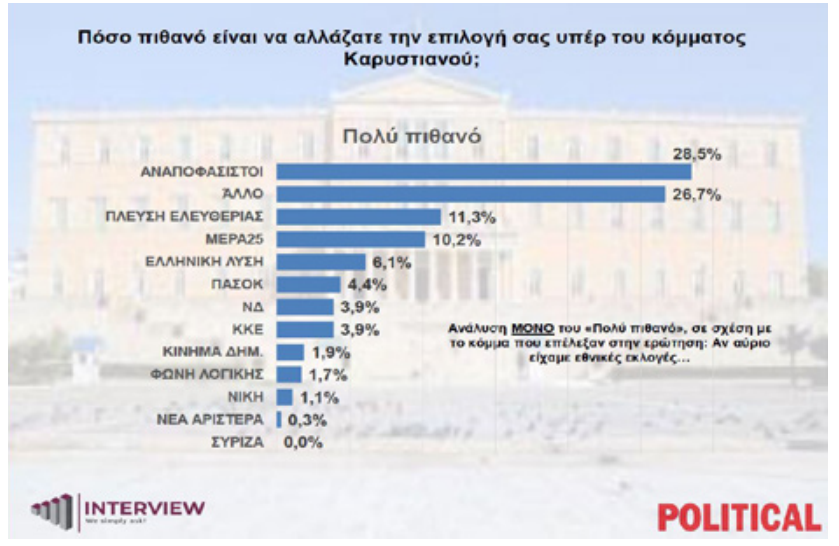 Την ίδια ώρα, σύμφωνα με τη δημοσκόπηση, ένα πιθανό κόμμα υπό τη Μαρία Καρυστιανού αντλεί στήριξη κυρίως από τους αναποφάσιστους (28,5%) και σε μικρότερο βαθμό από την Πλεύση Ελευθερίας, το ΜέΡΑ25 και την Ελληνική Λύση. Το 14,5% δηλώνει ότι είναι «πολύ πιθανό» να το ψηφίσει.