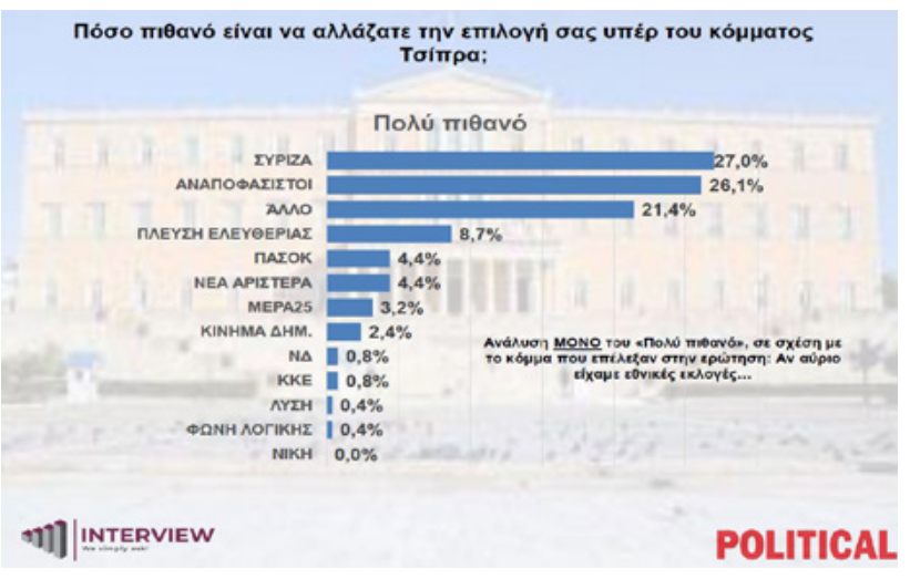 Στον αντίποδα, ένα νέο πιθανό κόμμα υπό τον πρώην πρωθυπουργό Αλέξη Τσίπρα φαίνεται να πλήττει πρωτίστως τον ΣΥΡΙΖΑ, καθώς το 27% των ψηφοφόρων του δηλώνει έτοιμο να μετακινηθεί. Το συνολικό ενδιαφέρον παραμένει χαμηλότερο, με 10,1% να δηλώνει «πολύ πιθανό» να το στηρίξει.
