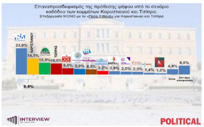 Πάντως, στην περίπτωση δημιουργίας των νέων κομμάτων, η ΝΔ παραμένει πρώτη (23,9%), η Καρυστιανού καταλαμβάνει τη δεύτερη θέση (14,5%), το ΠΑΣΟΚ τρίτο (10,5%) και το κόμμα Τσίπρα τέταρτο (10%), αυξάνονοντας ακόμα περισσότερο την πίεση στα μικρότερα κόμματα.