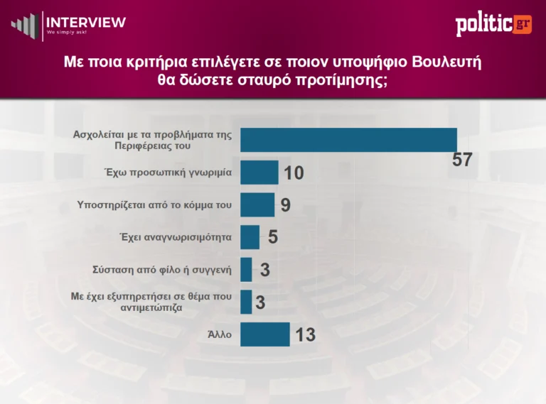 Το βασικό κριτήριο επιλογής υποψηφίου βουλευτή φαίνεται να είναι η ενασχόληση με τα προβλήματα της περιοχής, καθώς το 57% δηλώνει ότι ψηφίζει με αυτό το κριτήριο. Πολύ χαμηλότερα ακολουθούν η προσωπική γνωριμία (10%) και η κομματική στήριξη (9%), ενώ η αναγνωρισιμότητα περιορίζεται στο 5%. Ακόμη χαμηλότερα βρίσκονται η σύσταση από τρίτους και η προσωπική εξυπηρέτηση (3%).