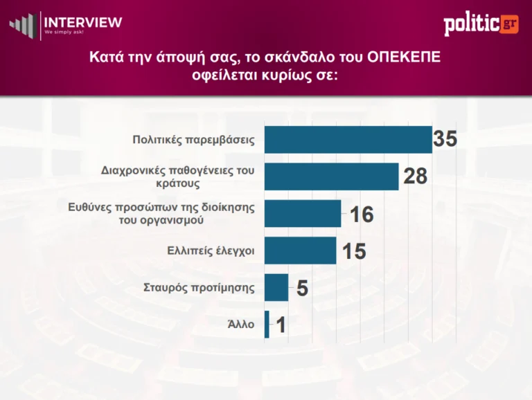 Όσον αφορά στο σκάνδαλο του ΟΠΕΚΕΠΕ, οι πολίτες αποδίδουν την ευθύνη πρωτίστως σε πολιτικές παρεμβάσεις. Συγκεκριμένα, το 35% θεωρεί ότι το ζήτημα προκύπτει από πολιτικές παρεμβάσεις, ενώ το 28% το συνδέει με διαχρονικές παθογένειες του κράτους.