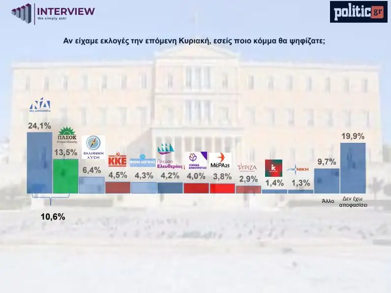 Δημοσκόπηση Interview: Σταθερό προβάδισμα για ΝΔ, εδραιώνεται το δίπολο ΝΔ – ΠΑΣΟΚ – Πρωταθλητές οι αναποφάσιστοι και ο “κανένας”