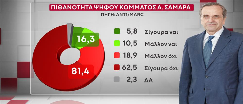 Για τον Αλέξη Τσίπρα, το 72,8% τόνισε ότι δεν θα ψήφιζε το κόμμα του Αλέξη Τσίπρα, ενώ για τον Αντώνη Σαμαρά, το ποσοστό του «Όχι» είναι στο 41,5%.