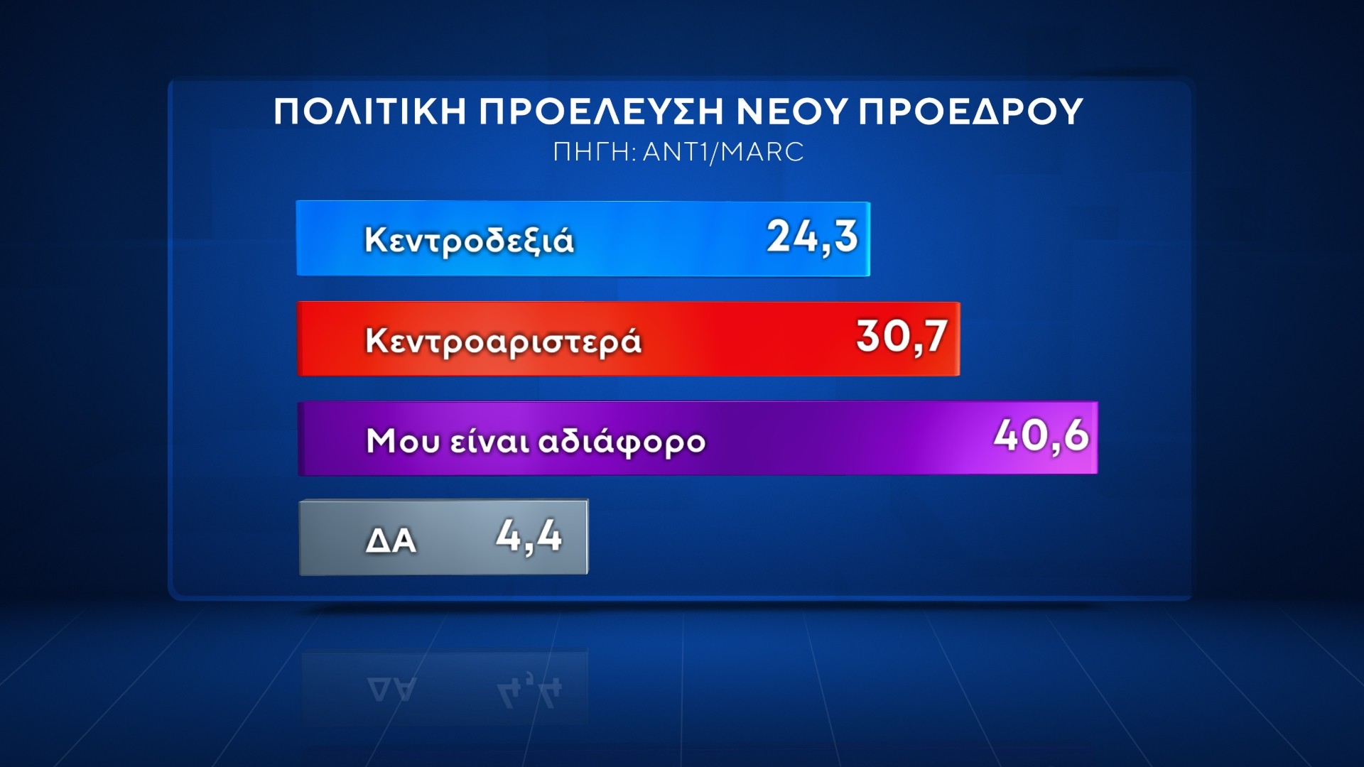 Σχετικά με το ζήτημα της εκλογής Προέδρου της Δημοκρατίας και την πολιτική προέλευση του προσώπου που θα αναλάβει το ανώτατο αξίωμα την επόμενη πενταετία το 24,3% των ερωτηθέντων απάντησε ότι πρέπει να προέρχεται από την κεντροδεξιά, ενώ το 30,7% ότι πρέπει να προέρχεται από την Κεντροαριστερά.