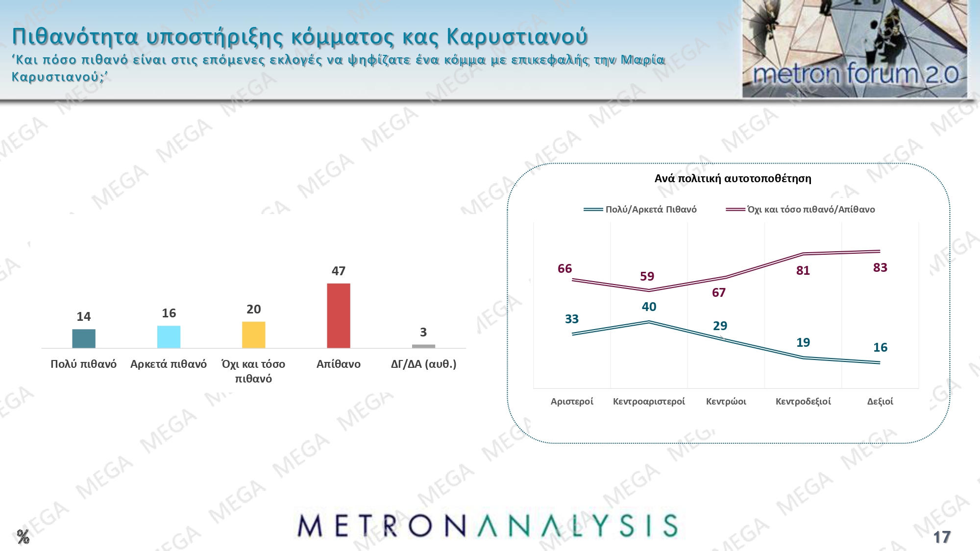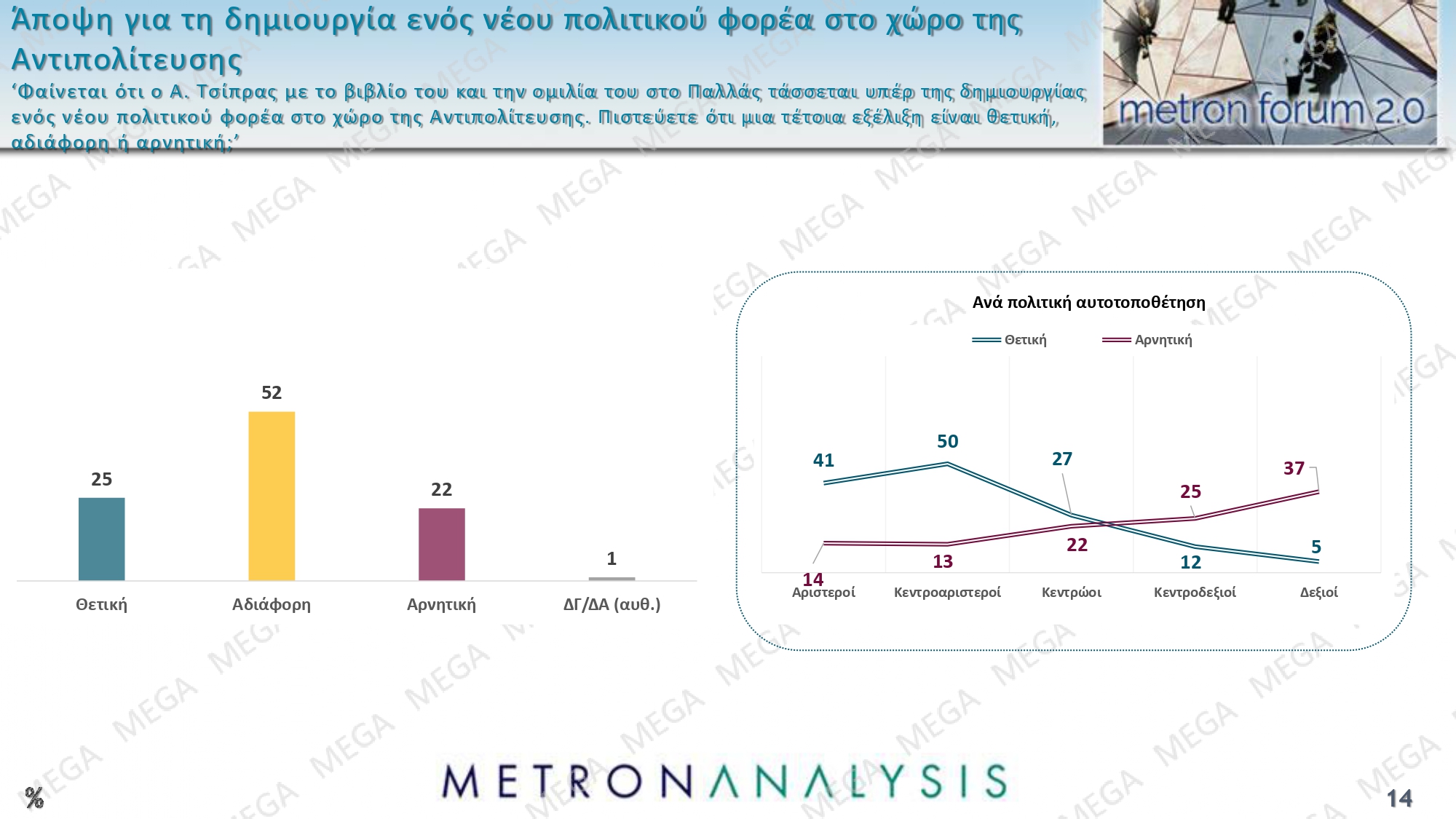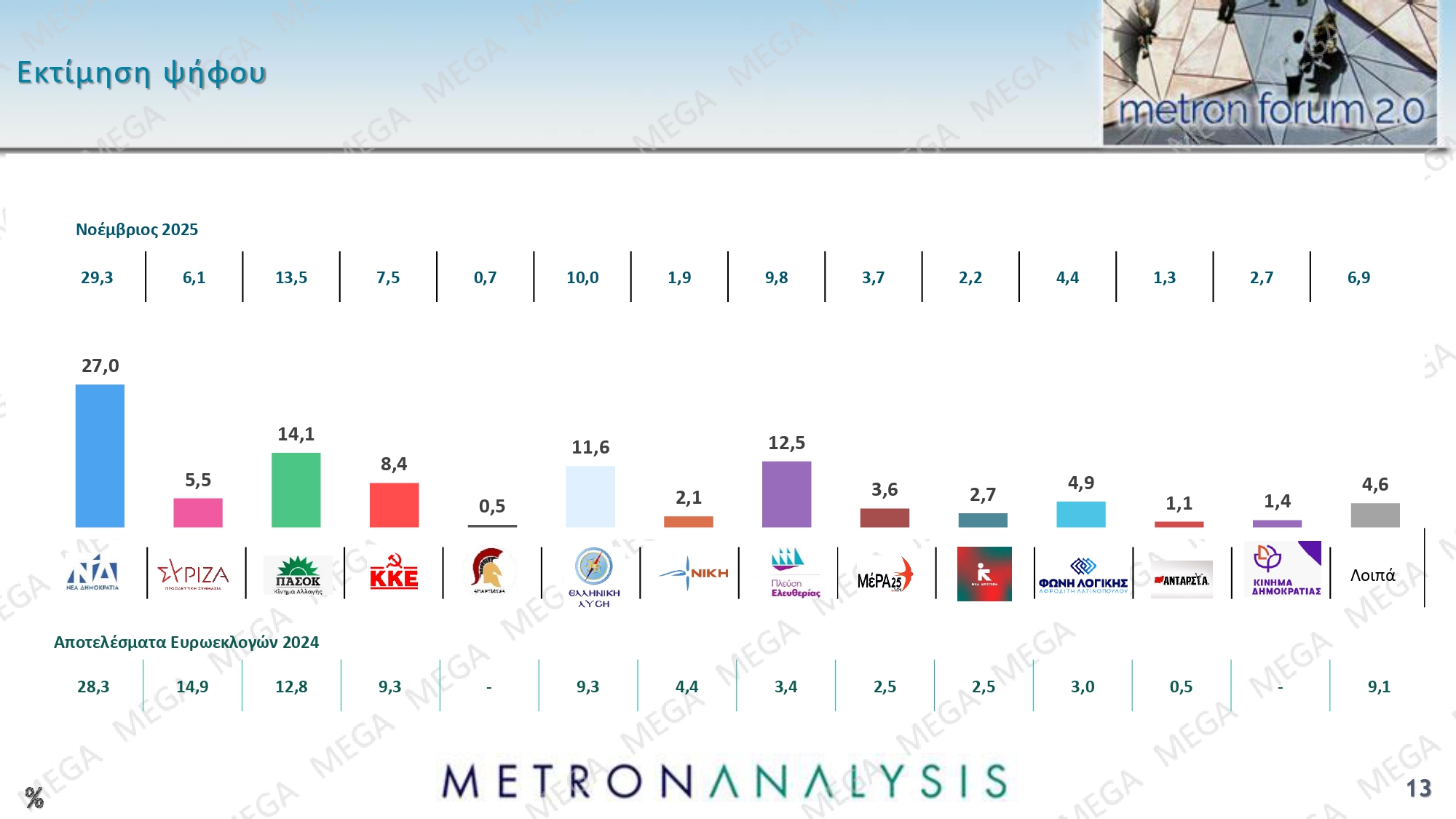 Στο 12,9% βρίσκεται η διαφορά ανάμεσα στη Νέα Δημοκρατία και το ΠΑΣΟΚ σύμφωνα με την δημοσκόπηση της Metron Analysis για το MEGA.