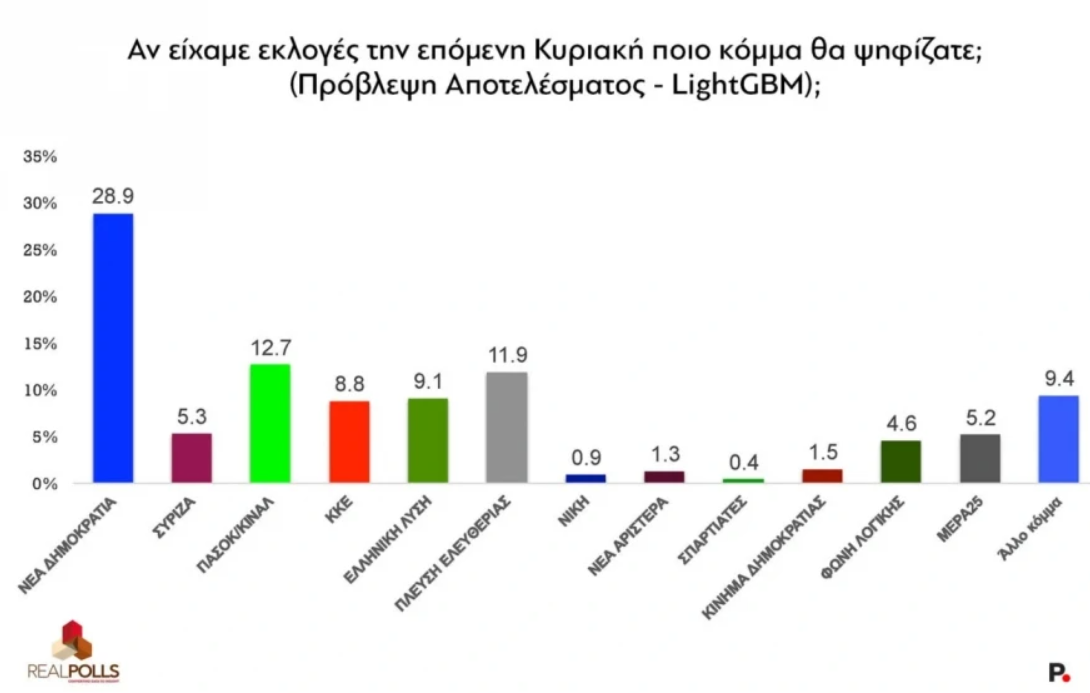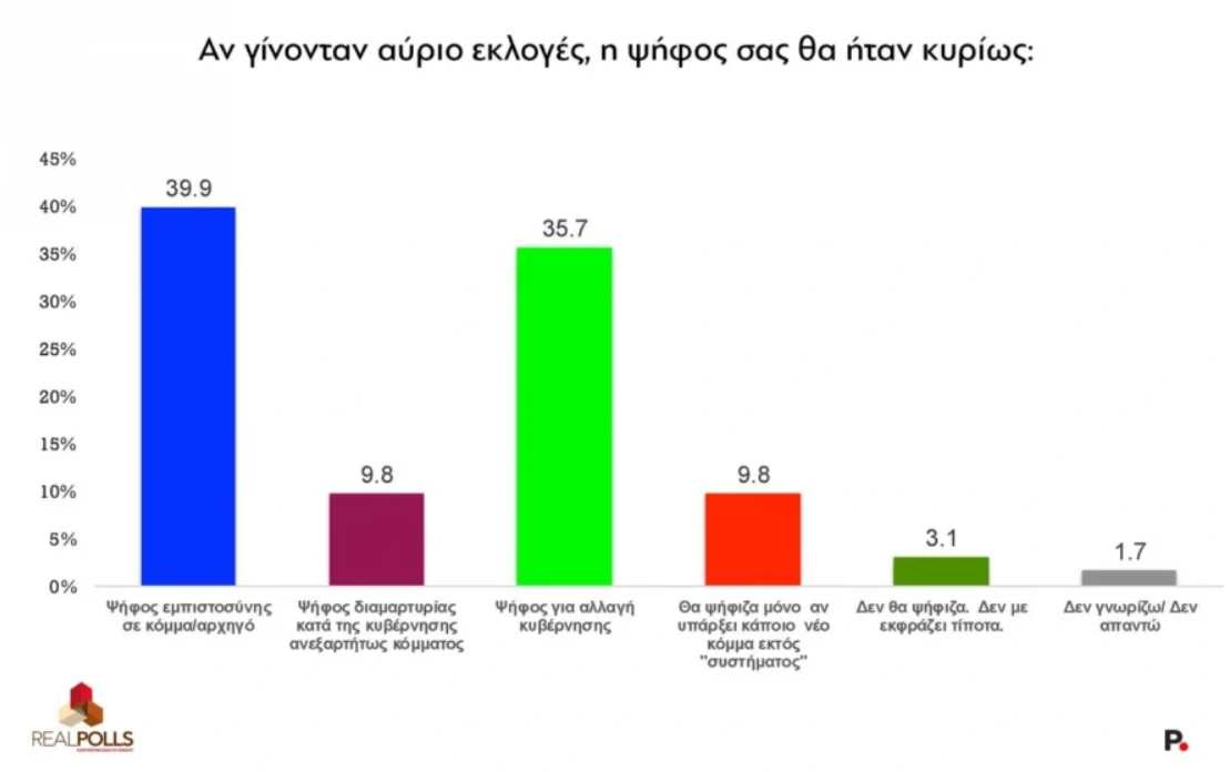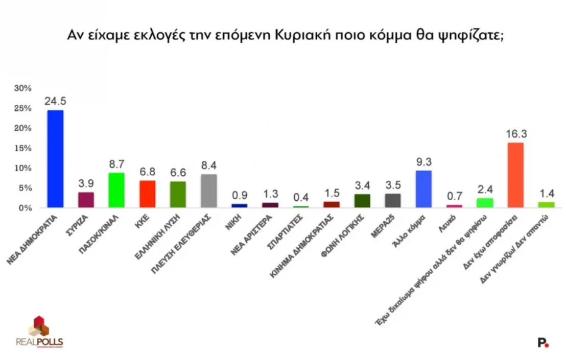 Δημοσκόπηση RealPolls: Κυρίαρχη η ΝΔ με διαφορά 16 μονάδων – To κόμμα που εμφανίζει ανοδική δύναμη και οι ανατροπές
