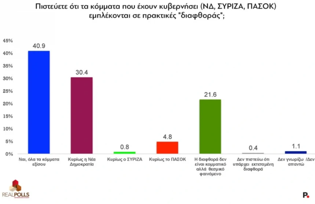 Η εικόνα γενικευμένης δυσπιστίας αποτυπώνεται και στις απαντήσεις για τη διαφθορά: το 40,9% θεωρεί ότι όλα τα κόμματα που έχουν κυβερνήσει –ΝΔ, ΣΥΡΙΖΑ και ΠΑΣΟΚ– εμπλέκονται εξίσου, ενώ το 30,4% στρέφει τα βέλη κυρίως κατά της Νέας Δημοκρατίας.