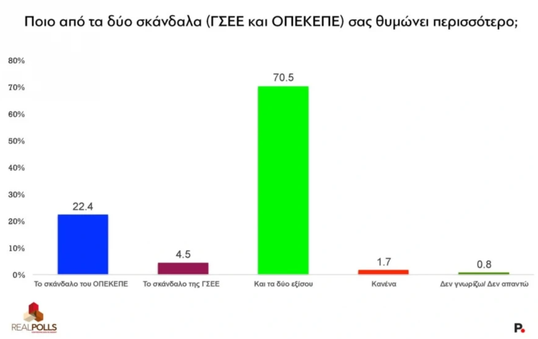 Στο πεδίο της πολιτικής επικαιρότητας, το 70,5% των ερωτηθέντων δηλώνει ότι θυμώνει εξίσου τόσο με το σκάνδαλο του ΟΠΕΚΕΠΕ όσο και με εκείνο της ΓΣΕΕ, ενώ μόλις το 22,4% εστιάζει αποκλειστικά στον ΟΠΕΚΕΠΕ και το 4,5% στη ΓΣΕΕ.