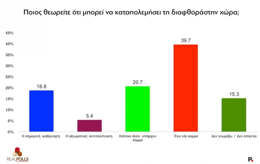Στην ερώτηση ποιος μπορεί να καταπολεμήσει αποτελεσματικά τη διαφθορά, το 39,7% απαντά «ένα νέο κόμμα», επιβεβαιώνοντας τη σταθερή τάση αναζήτησης εναλλακτικής λύσης εκτός του υφιστάμενου πολιτικού συστήματος.
