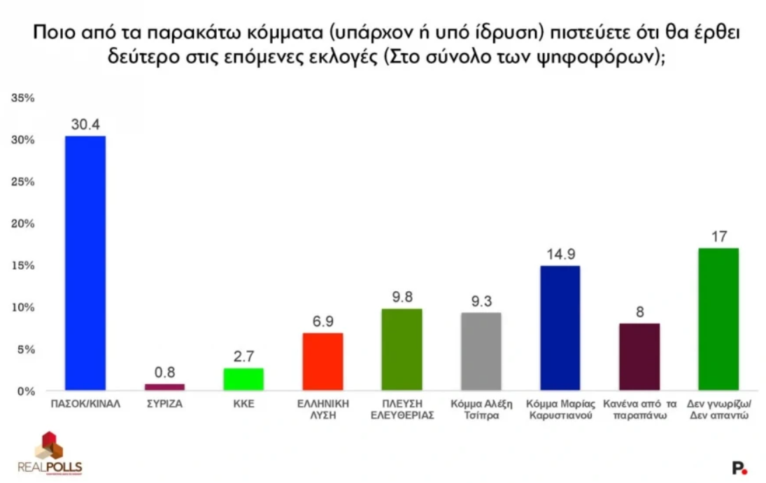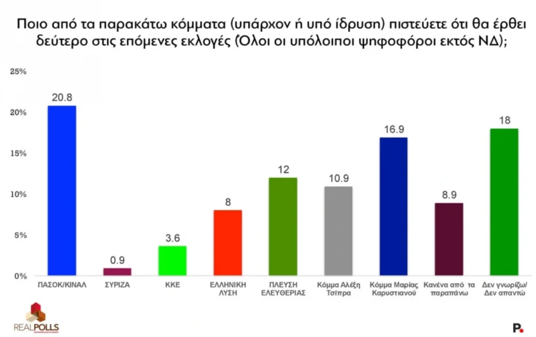 Ξεχωριστό ενδιαφέρον παρουσιάζει η «μάχη» για τη δεύτερη θέση. Στο σύνολο των ερωτηθέντων, το ΠΑΣΟΚ-ΚΙΝΑΛ προηγείται με 30,4% στην εκτίμηση για το ποιο κόμμα θα τερματίσει δεύτερο, ακολουθούμενο από το πιθανολογούμενο κόμμα Καρυστιανού με 14,9%, την Πλεύση Ελευθερίας με 9,8% και το κόμμα Τσίπρα με 9,3%.