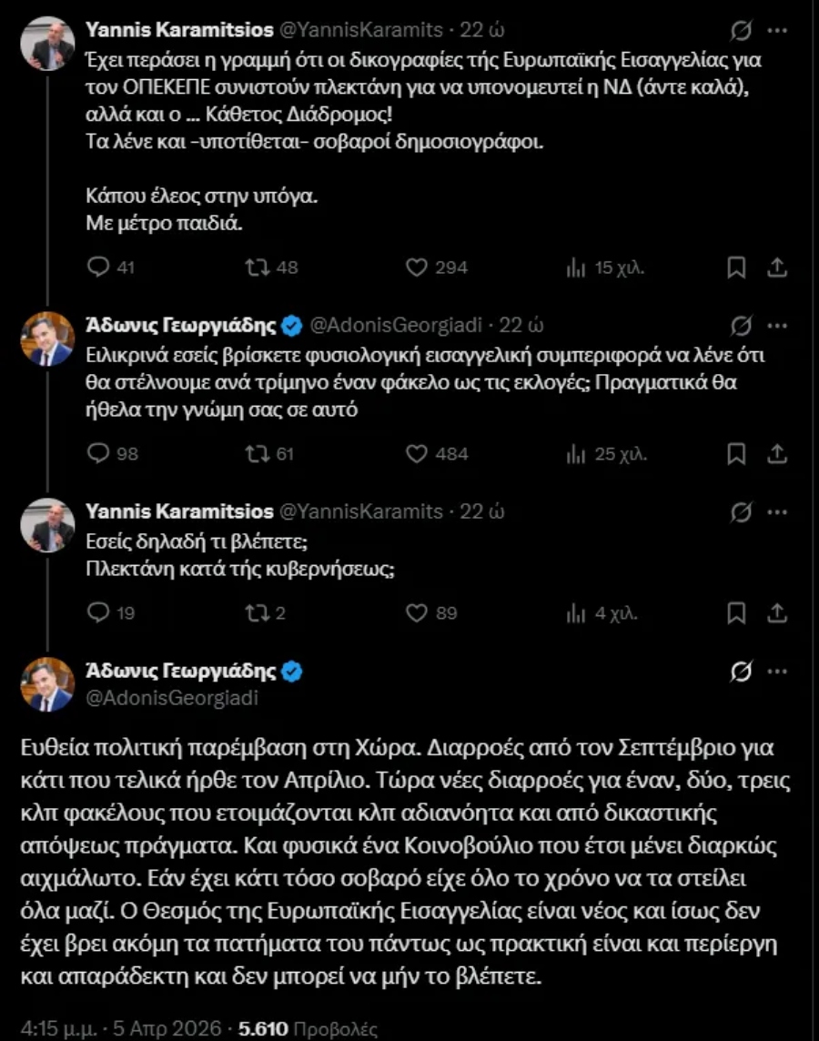 Συγκεκριμένα, ο κ. Γεωργιάδης απάντησε σε χρήστη του «Χ» που τον ρωτάει εάν βλέπει «πλεκτάνη κατά της κυβερνήσεως». Ο υπουργός έγραψε τα εξής: «Ευθεία πολιτική παρέμβαση στη Χώρα. Διαρροές από τον Σεπτέμβριο για κάτι που τελικά ήρθε τον Απρίλιο. Τώρα νέες διαρροές για έναν, δύο, τρεις κλπ φακέλους που ετοιμάζονται κλπ αδιανόητα και από δικαστικής απόψεως πράγματα. Και φυσικά ένα Κοινοβούλιο που έτσι μένει διαρκώς αιχμάλωτο. Εάν έχει κάτι τόσο σοβαρό είχε όλο το χρόνο να τα στείλει όλα μαζί. Ο Θεσμός της Ευρωπαϊκής Εισαγγελίας είναι νέος και ίσως δεν έχει βρει ακόμη τα πατήματα του πάντως ως πρακτική είναι και περίεργη και απαράδεκτη και δεν μπορεί να μην το βλέπετε».