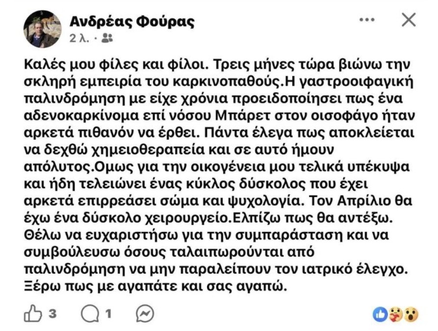 «Καλές μου φίλες και φίλοι. Τρεις μήνες τώρα βιώνω την σκληρή εμπειρία του καρκινοπαθούς. Η γαστροοιφαγική παλινδρόμηση με είχε χρόνια προειδοποιήσει πως ένα αδενοκαρκίνομα επί νόσου Μπάρετ στον οισοφάγο ήταν αρκετά πιθανόν να έρθει. Πάντα έλεγα πως αποκλείεται να δεχθώ χημειοθεραπεία και σε αυτό ήμουν απόλυτος.