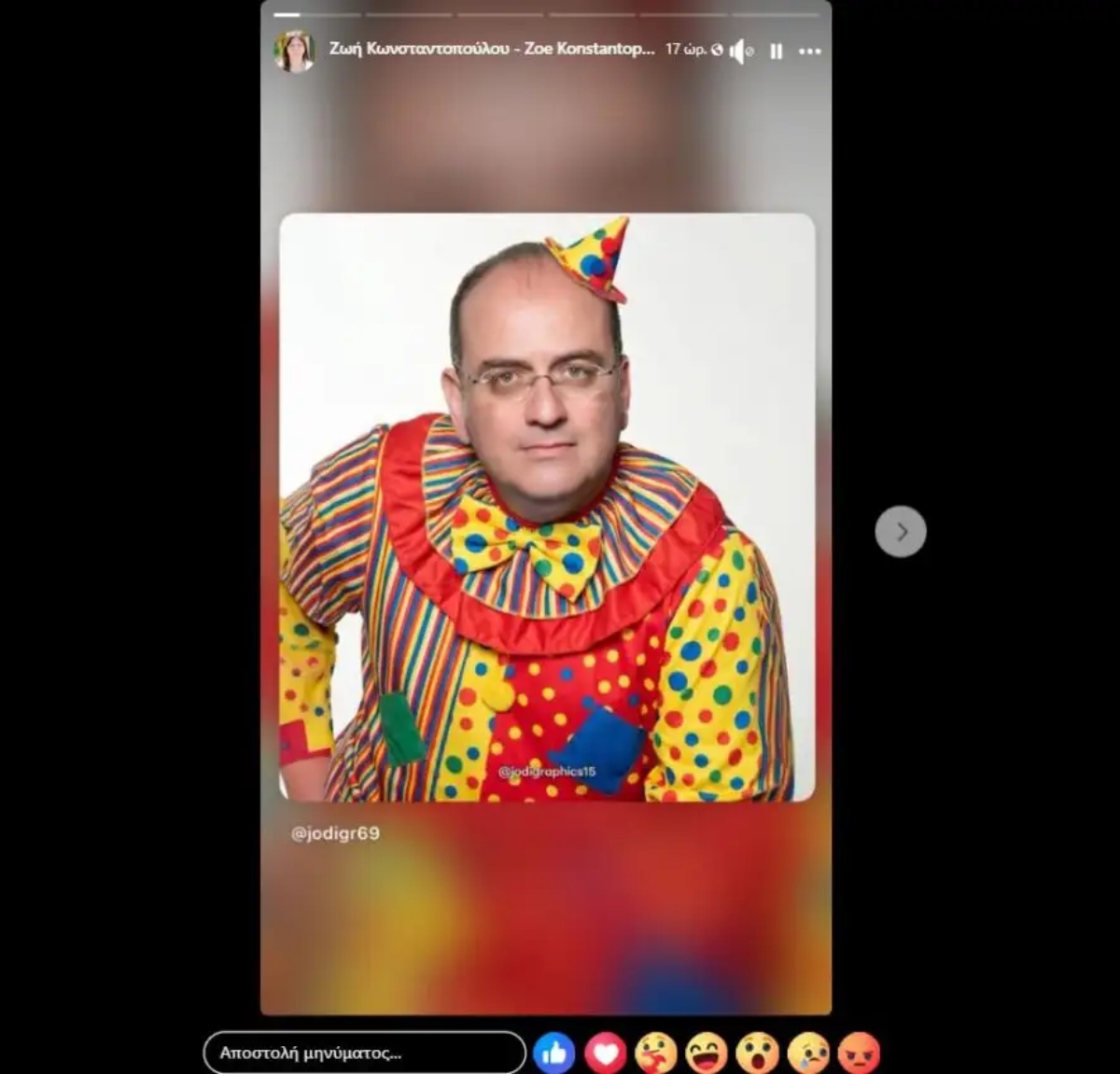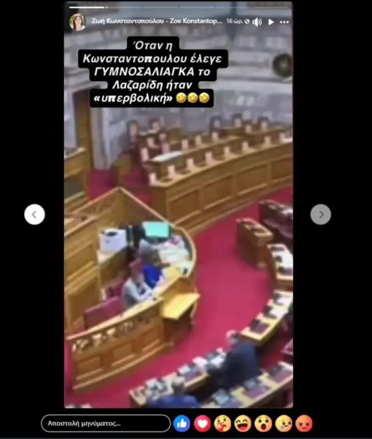 Σε story που ανήρτησε η κ. Κωνσταντοπούλου στο Facebook, εμφανίζει η φωτογραφία του Μακάριου Λαζαρίδη επεξεργασμένη ώστε να παρουσιάζεται ντυμένος κλόουν. Η πρόεδρος της Πλεύσης Ελευθερίας ενσωμάτωσε στην ίδια ανάρτηση και απόσπασμα από παλαιότερη τοποθέτηση της στη Βουλή, συνοδεύοντάς το με τη φράση: «Όταν η Κωνσταντοπούλου έλεγε γυμνοσάλιαγκα το Λαζαρίδη ήταν “υπερβολική”».