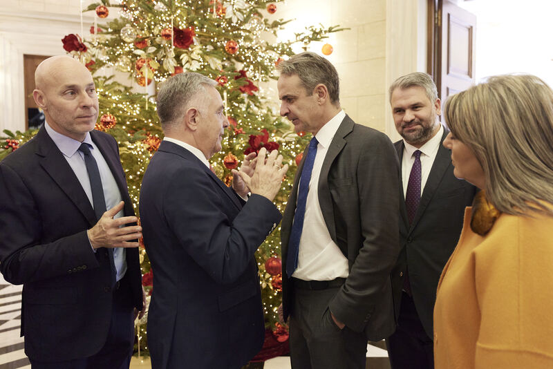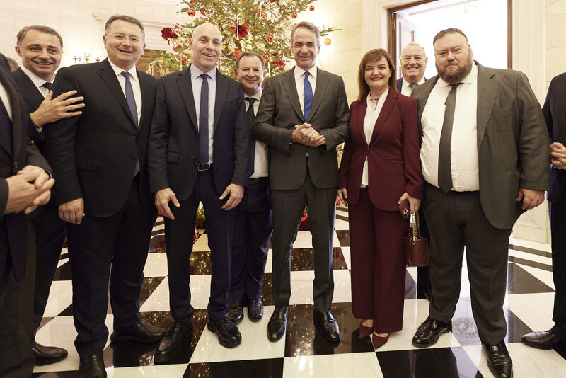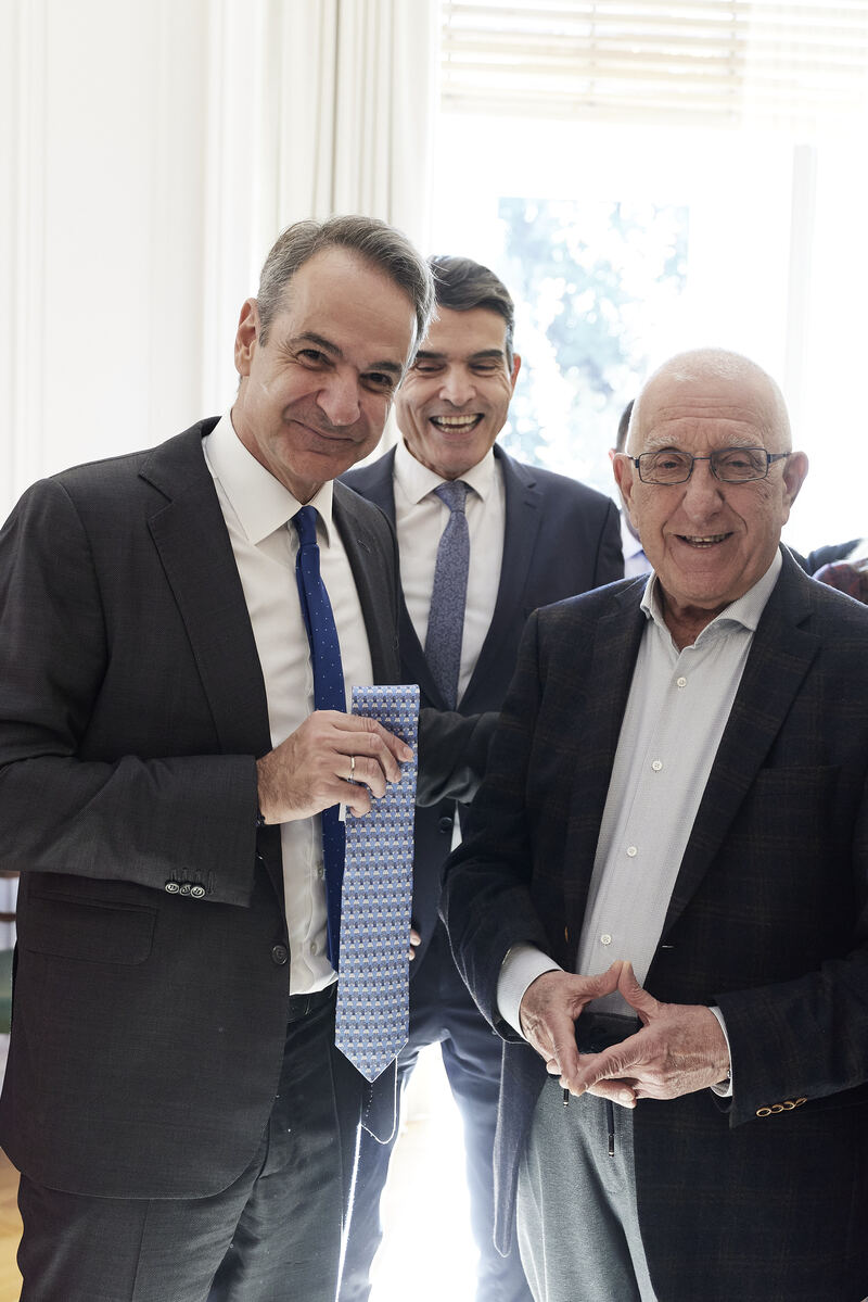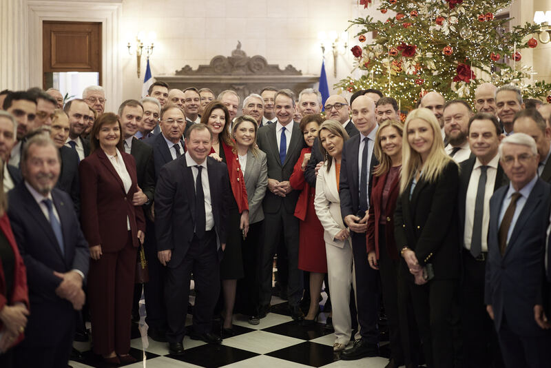 Ο πρωθυπουργός δέχτηκε δώρο μία γραβάτα από τον Πρόεδρο της Βουλής Νικήτα Κακλαμάνη, ενώ ο Κυριάκος Μητσοτάκης χάρισε στους βουλευτές το γούρι για το 2026.