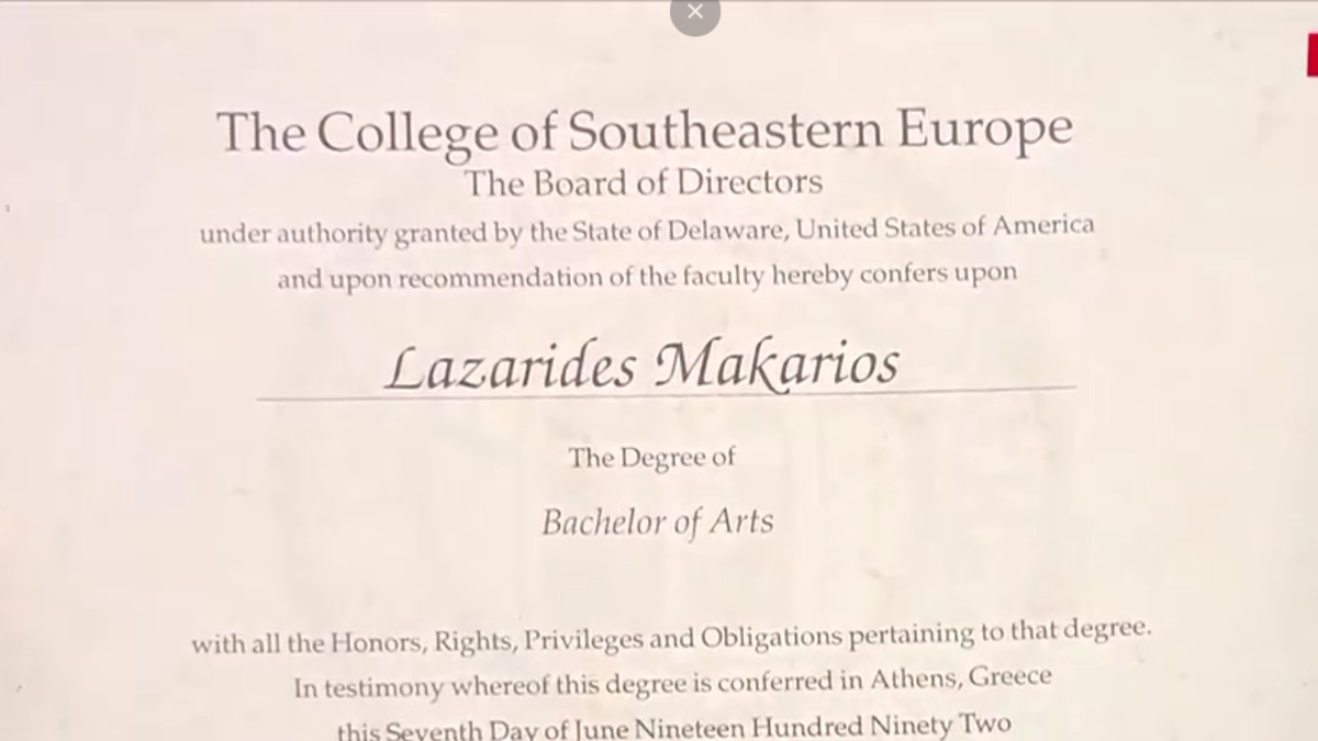 «Κολέγιο της Νοτιοδυτικής Ευρώπης – Διοικητικό Συμβούλιο: Με την εξουσία που παρέχεται από την Πολιτεία του Ντέλαγουεαρ, των Ηνωμένων Πολιτειών Αμερικής, και κατόπιν συστάσεων του προσωπικού, με το κατωτέρω απονέμουμε στον Λαζαρίδη Μακάριο το Δίπλωμα Bachelor στις Τέχνες».