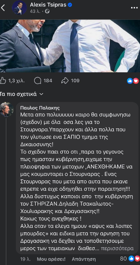 Το πλέον ενδιαφέρον είναι ότι ανάμεσα στα σχόλια που συγκέντρωσε η μακροσκελής ανάρτηση του Αλέξη Τσίπρα ήταν και αυτό του βουλευτή του ΣΥΡΙΖΑ Παύλου Πολάκη, κάτι που δεν πέρασε απαρατήρητο.