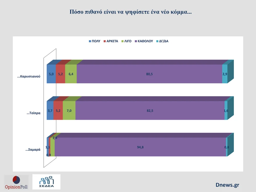 Την ίδια στιγμή οι πολιτικοί μνηστήρες για δυσαρεστημένους ψηφοφόρους της “πράσινης” παράταξης αυξάνονται καθώς μπαίνουν στο παιχνίδι των δημοσκοπήσεων τα επερχόμενα κόμματα Καρυστιανού και Τσίπρα.