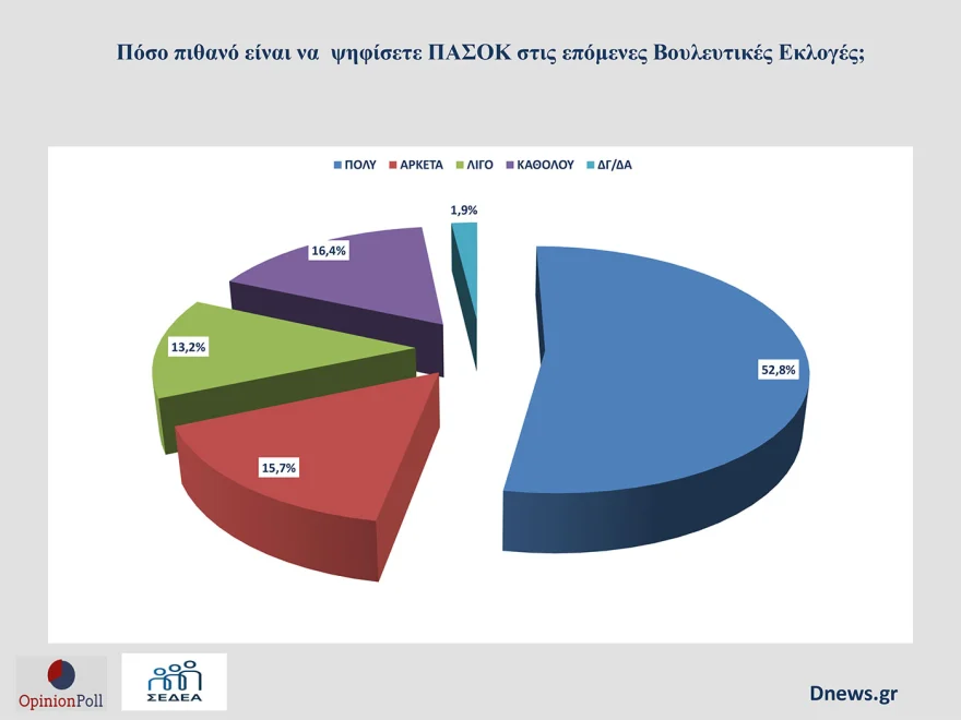 Παρότι, δε, το 68.5% δηλώνει ότι είναι πολύ και αρκετά πιθανό να το ψηφίσουν, ωστόσο υπάρχει ένα διόλου ευκαταφρόνητο 29.6% που δηλώνει λίγο και καθόλου πιθανό να επιλέξει ΠΑΣΟΚ στην κάλπη με ένα 16.4% να αποκλείει κατηγορηματικά να το ξαναψηφίσει.