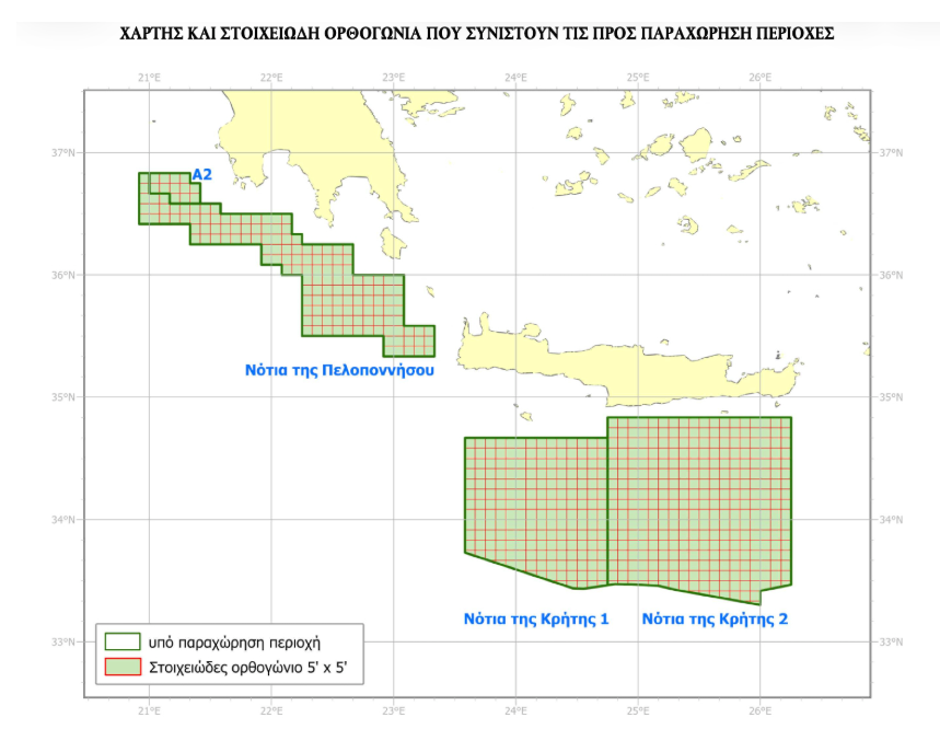 Οι συμβάσεις αφορούν στην παραχώρηση αποκλειστικών δικαιωμάτων έρευνας και εκμετάλλευσης υδρογονανθράκων σε θαλάσσιες περιοχές νότια της Πελοποννήσου και της Κρήτης.