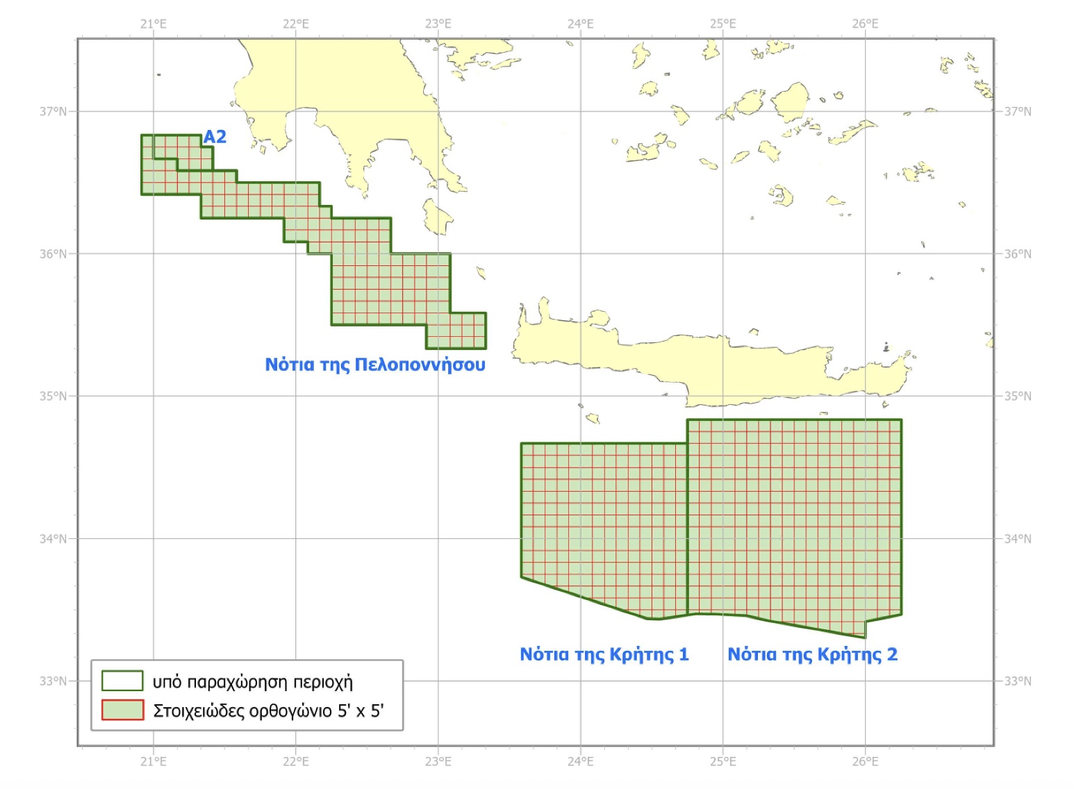 Πρόκειται για τις περιοχές συνολικής έκτασης 47 χιλιάδων τετραγωνικών χιλιομέτρων νοτίως της Πελοποννήσου (περιοχές «Α2» και «Νότια της Πελοποννήσου») και στις θαλάσσιες περιοχές νοτίως της Κρήτης (περιοχές «Νότια της Κρήτης 1» και «Νότια της Κρήτης 2») οι οποίες μετά την υπογραφή των σχετικών συμβάσεων, την έγκρισή τους από το Ελεγκτικό Συνέδριο και την κύρωσή τους από τη Βουλή παραχωρούνται για έρευνες υδρογονανθράκων στις κοινοπραξίες των ομίλων Chevron – Helleniq Energy.
