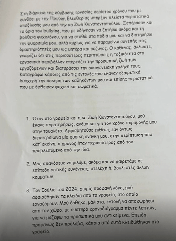 «Στη διάρκεια της σύμβασης εργασίας αορίστου χρόνου που με συνδέει με την Πλεύση Ελευθερίας υπήρξαν πλείστα περιστατικά απαξίωσης μου από την κα Ζωή Κωνσταντοπούλου. Ξεπέρασαν και τα όρια του bullying, που με οδήγησαν να ζητήσω ακόμα και τη βοήθεια ψυχολόγου, για να σταθώ στα πόδια μου και να διατηρήσω την ψυχραιμία μου, αλλά κυρίως για να παραμείνω συνεπής στις δραστηριότητές μου ως μητέρα και σύζυγος. Ο καθένας, άλλωστε, γνωρίζει ότι στις περισσότερες περιπτώσεις η τοξικότητα στο εργασιακό περιβάλλον επηρεάζει την προσωπική ζωή των εργαζομένων και διαταράσσει την οικογενειακή γαλήνη τους. Καταγράφω κάποιες από τις εντολές που έκαναν εξαιρετικά δυσχερή την άσκηση των καθηκόντων μου και επίσης περιστατικά που με έφθειραν ψυχικά και σωματικά.