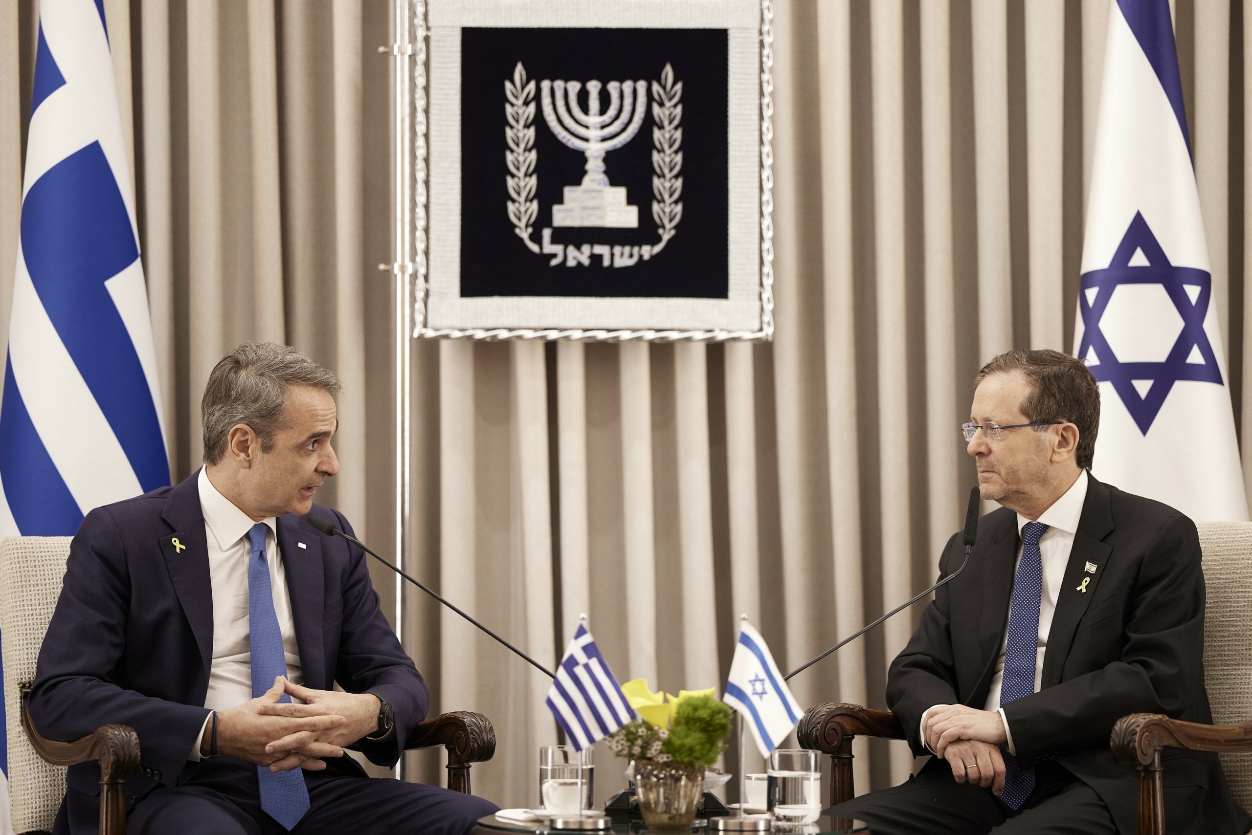 Κυριάκος Μητσοτάκης: Σας ευχαριστώ, κ. Πρόεδρε, για την πολύ θερμή υποδοχή και που με τιμάτε με τη φιλία σας. Γνωρίζετε πόσο μεγάλη αξία δίνουμε στη στρατηγική εταιρική σχέση μεταξύ Ελλάδας και Ισραήλ. Και, πράγματι, έρχομαι στο Ισραήλ, για άλλη μια φορά, σε πολύ δύσκολους, σε πολύ ταραγμένους καιρούς.
