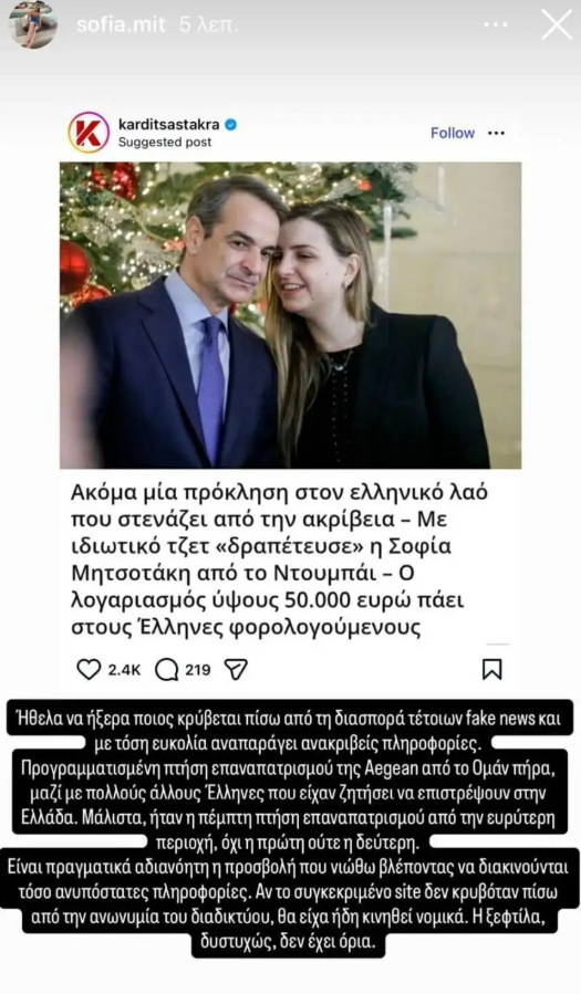 Σοφία Μητσοτάκη: «Η ξεφτίλα δεν έχει όρια» – Η οργισμένη αντίδραση σε δημοσίευμα για την επιστροφή της από το Ντουμπάι
