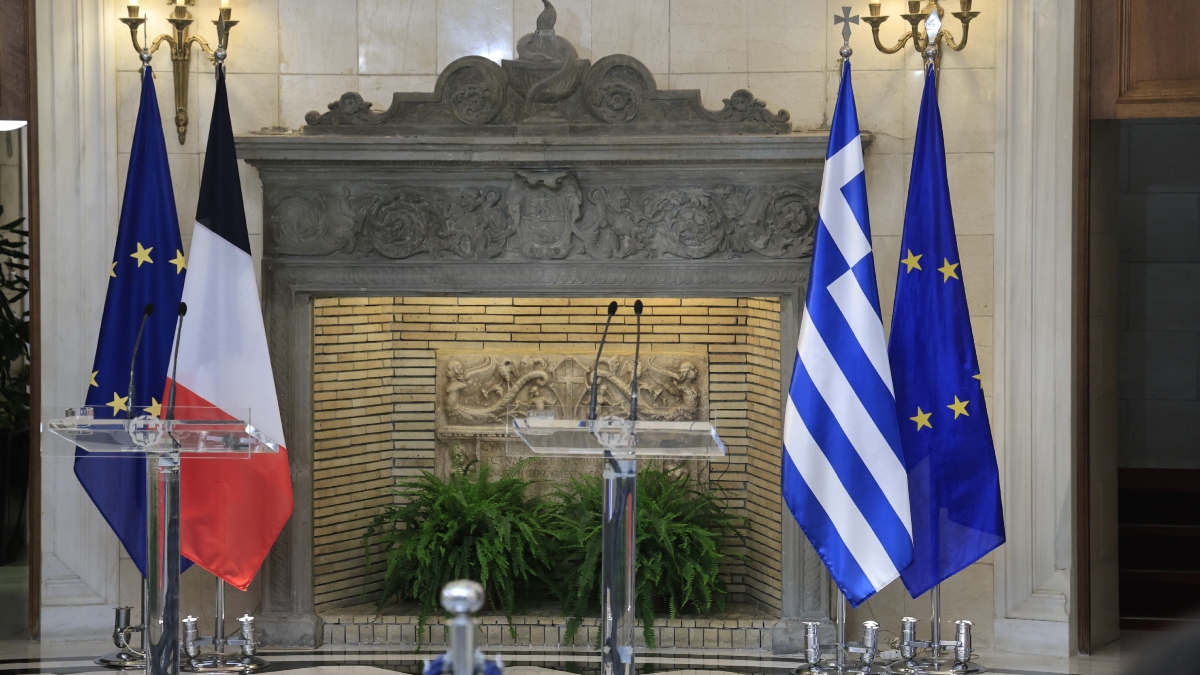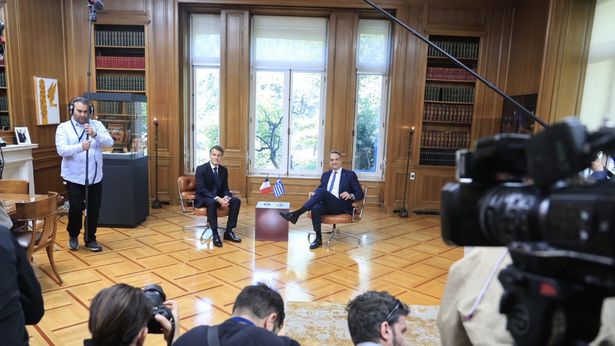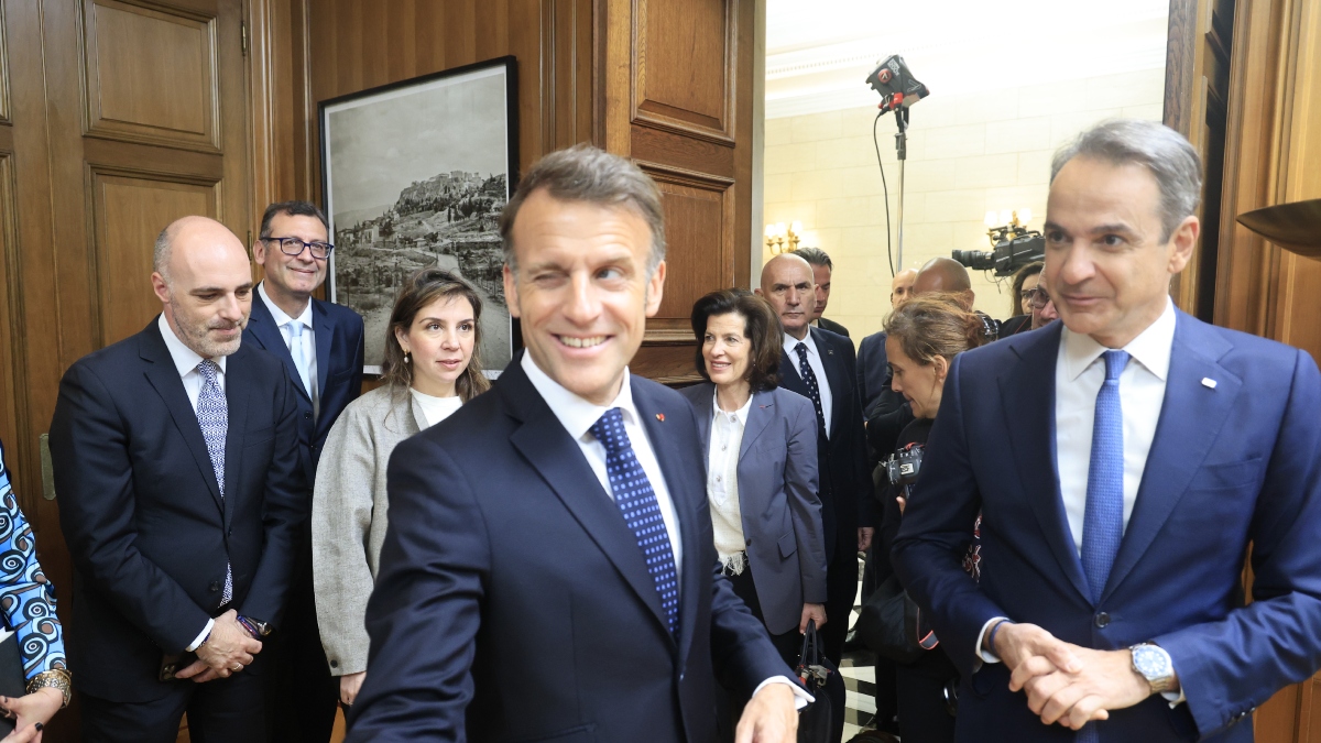 Σε συνέχεια της κοινής τους παρουσίας στο λιμάνι του Πειραιά, ο Κυριάκος Μητσοτάκης υποδέχθηκε στο Μέγαρο Μαξίμου τον Εμανουέλ Μακρόν.