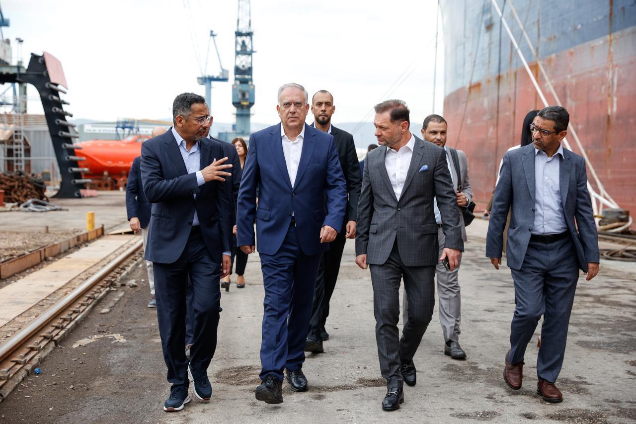 Στη συνέχεια επισκέφτηκαν τα Ναυπηγεία Ελευσίνας, όπου τους υποδέχθηκε ο πρόεδρος και διευθύνων σύμβουλος της ONEX Shipyards & Technologies, Πάνος Ξενοκώστας. Περιηγήθηκαν στις εγκαταστάσεις και ενημερώθηκαν για τις προοπτικές περαιτέρω ανάπτυξης των Ναυπηγείων Ελευσίνας, τις θέσεις εργασίας που δημιουργούνται και συζήτησαν για τιςδυνατότητες συνεργασίας με επενδυτικούς φορείς της Σαουδικής Αραβίας στον κρίσιμο τομέα της ναυπηγοβιομηχανίας, αλλά και της αμυντικής βιομηχανίας. Ιδιαίτερη έμφαση δόθηκε στη συμβολή των Ναυπηγείων στην αναγέννηση της ελληνικής ναυπηγικής βιομηχανίας, η οποία έχει ενταχθεί στις στρατηγικές επενδύσεις με πρωτοβουλίες του υπουργείου Ανάπτυξης.