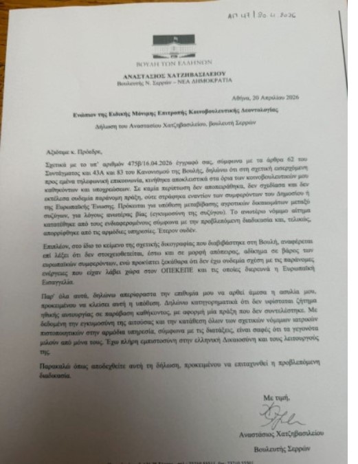 Ο βουλευτής της ΝΔ, Τάσος Χατζηβασιλείου ζήτησε την άρση ασυλίας σε υπόμνημά του στην αρμόδια επιτροπή της Βουλής, σχετικά με την υπόθεση του ΟΠΕΚΕΠΕ.
