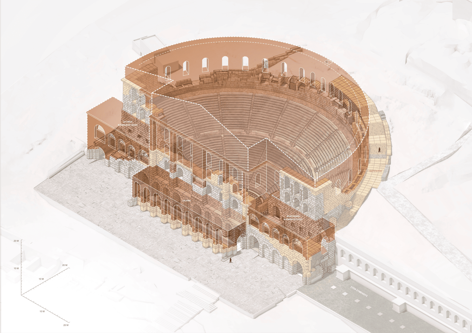 10. Η αναστήλωση του ανατολικού κλιμακοστασίου και της ανιούσας οδού προς τον Περίπατο επαναφέρει την αρχική λειτουργική σύνδεση του Ηρωδείου με τη Στοά του Ευμένους.