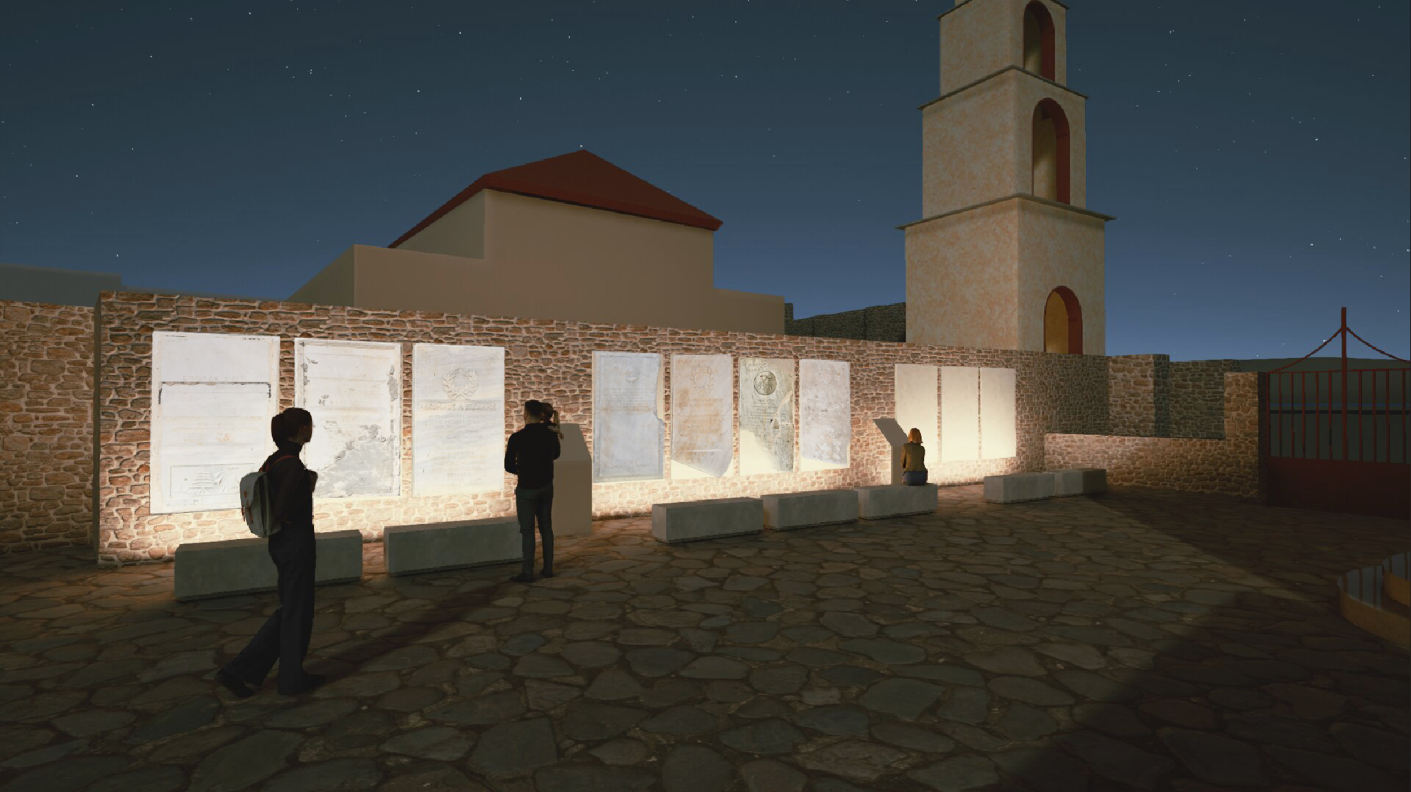 Ο χώρος εισόδου διαμορφώνεται ως υπαίθριος εκθεσιακός χώρος, όπου επανεντάσσονται ιστορικές επιτύμβιες πλάκες και λιθανάγλυφα. Οι τοίχοι λειτουργούν ως εκθεσιακές επιφάνειες και τοποθετούνται ενημερωτικές πινακίδες για την ιστορία και τη δομή του χώρου. Σχεδιάζεται διακριτικός αρχιτεκτονικός φωτισμός με στόχο την ανάδειξη των μνημείων και τη διατήρηση της ατμόσφαιρας μνήμης και περισυλλογής.