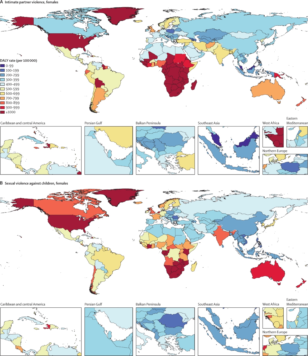Στις γυναίκες ηλικίας 15-29 ετών, η βία από ερωτικό σύντροφο και η σεξουαλική βία κατά των παιδιών κατατάσσονται παγκοσμίως στην τέταρτη και πέμπτη θέση, αντίστοιχα, μεταξύ των κινδύνων για την υγεία που σχετίζονται με πρόωρο θάνατο και αναπηρία. Στα αγόρια η σεξουαλική βία κατά παιδιών κατατάσσεται ενδέκατη.
